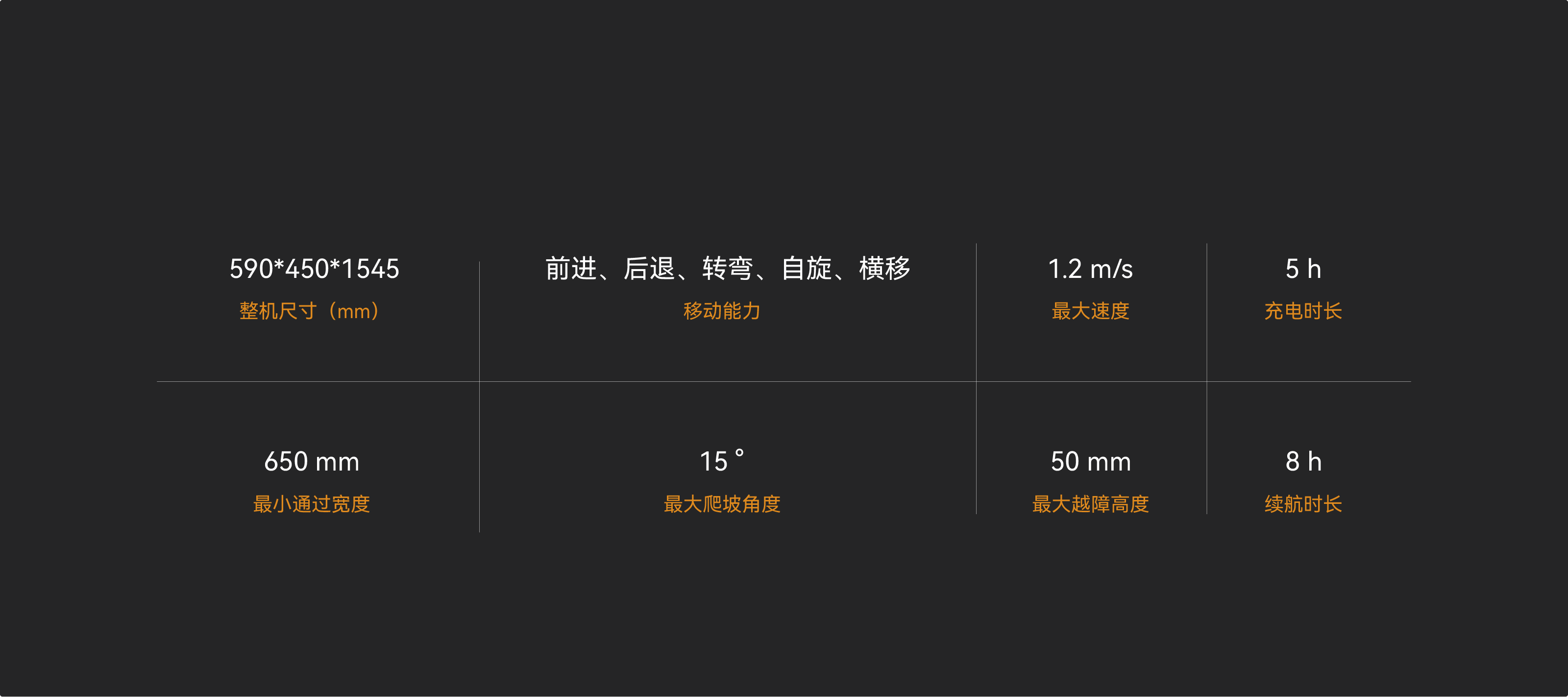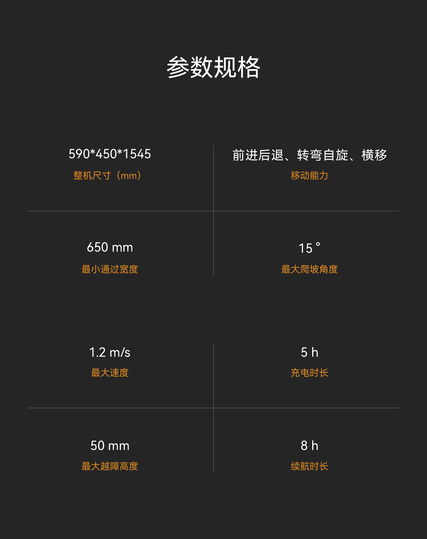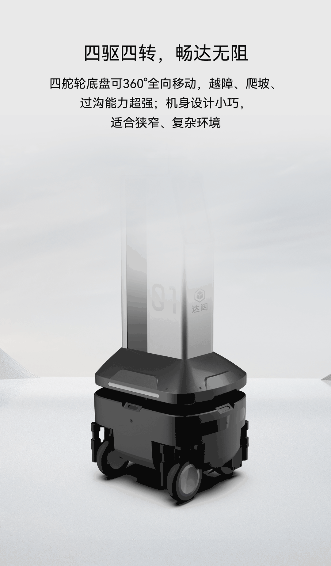 四舵轮底盘可360°全向移动,越障、爬坡、过沟能力超强;机身设计小巧,适合狭窄、复杂环境